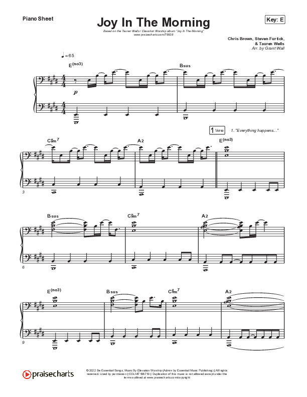 Download the piano sheet for Joy In The Morning by Tauren Wells / Elevation Worship, from the album Joy In The Morning. This song was arranged by Grant Wall in the key of E, Eb.
