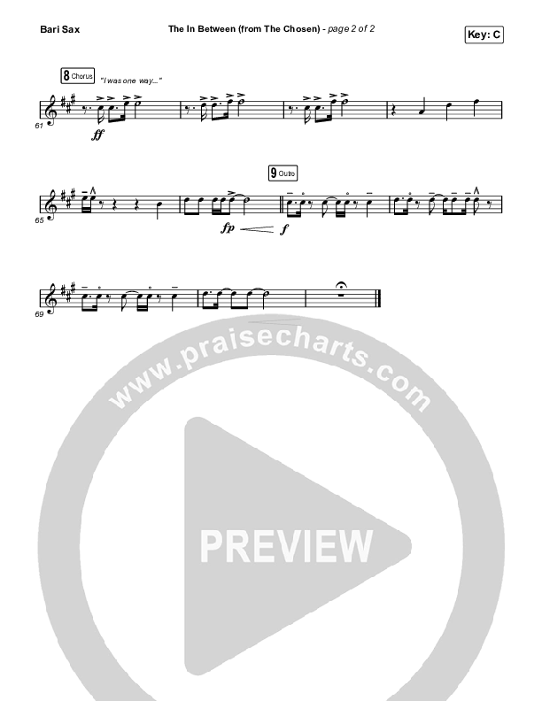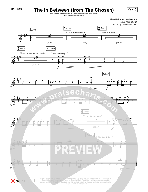 Download the Bari Sax sheet music for The In Between (From The Chosen) by Matt Maher, from the album The In Between (From The Chosen). This song was arranged by Grant Wall / Daniel Galbraith in the key of Bb, C.