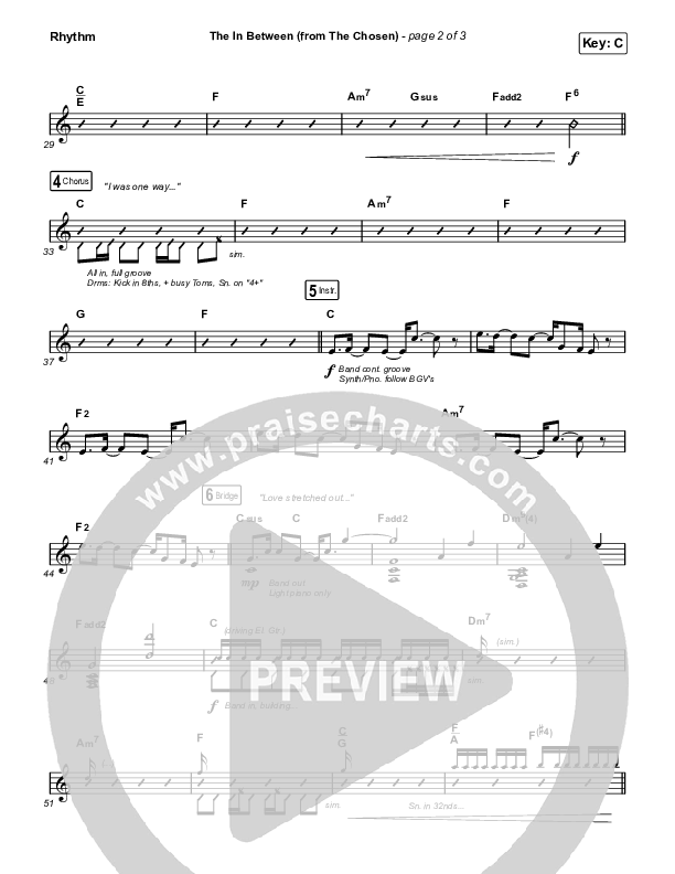 Download the PDF sheet music for The In Between (From The Chosen) by Matt Maher, from the album The In Between (From The Chosen). This song was arranged by Grant Wall / Daniel Galbraith in the key of Bb, C.