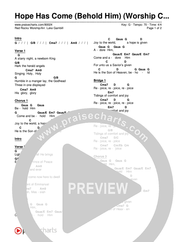 Download the PDF Chord Charts for Hope Has Come (Behold Him) (Worship Choir SAB) by Red Rocks Worship / Arr. Luke Gambill, from the album Hope Has Come. This song was arranged by Mason Brown / Daniel Galbraith / Luke Gambill in the key of G.