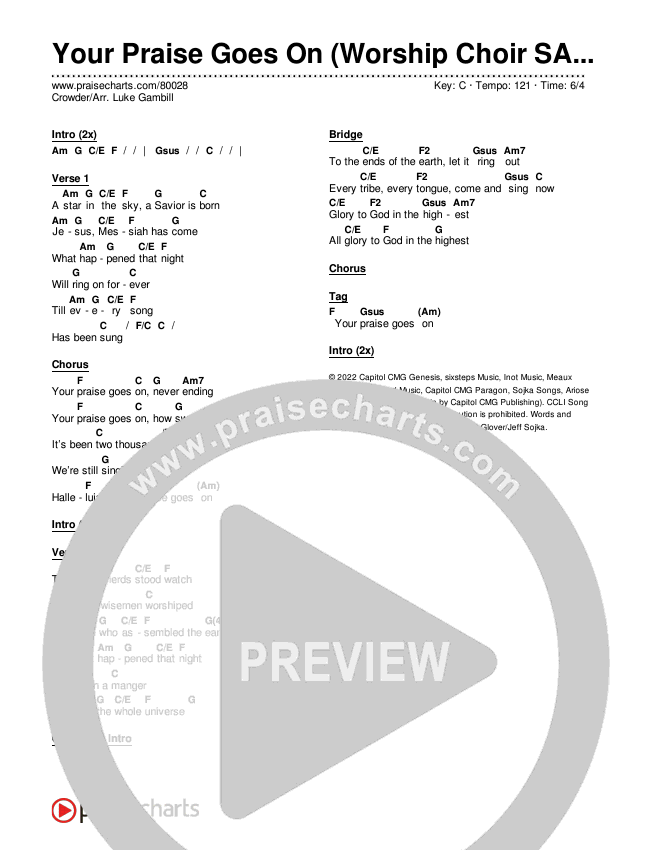 Download the PDF Chord Charts for Your Praise Goes On (Worship Choir SAB) by Crowder / Arr. Luke Gambill, from the album Milk & Cookies: A Very Crowder Christmas. This song was arranged by Luke Gambill / Daniel Galbraith / Grant Wall in the key of C.