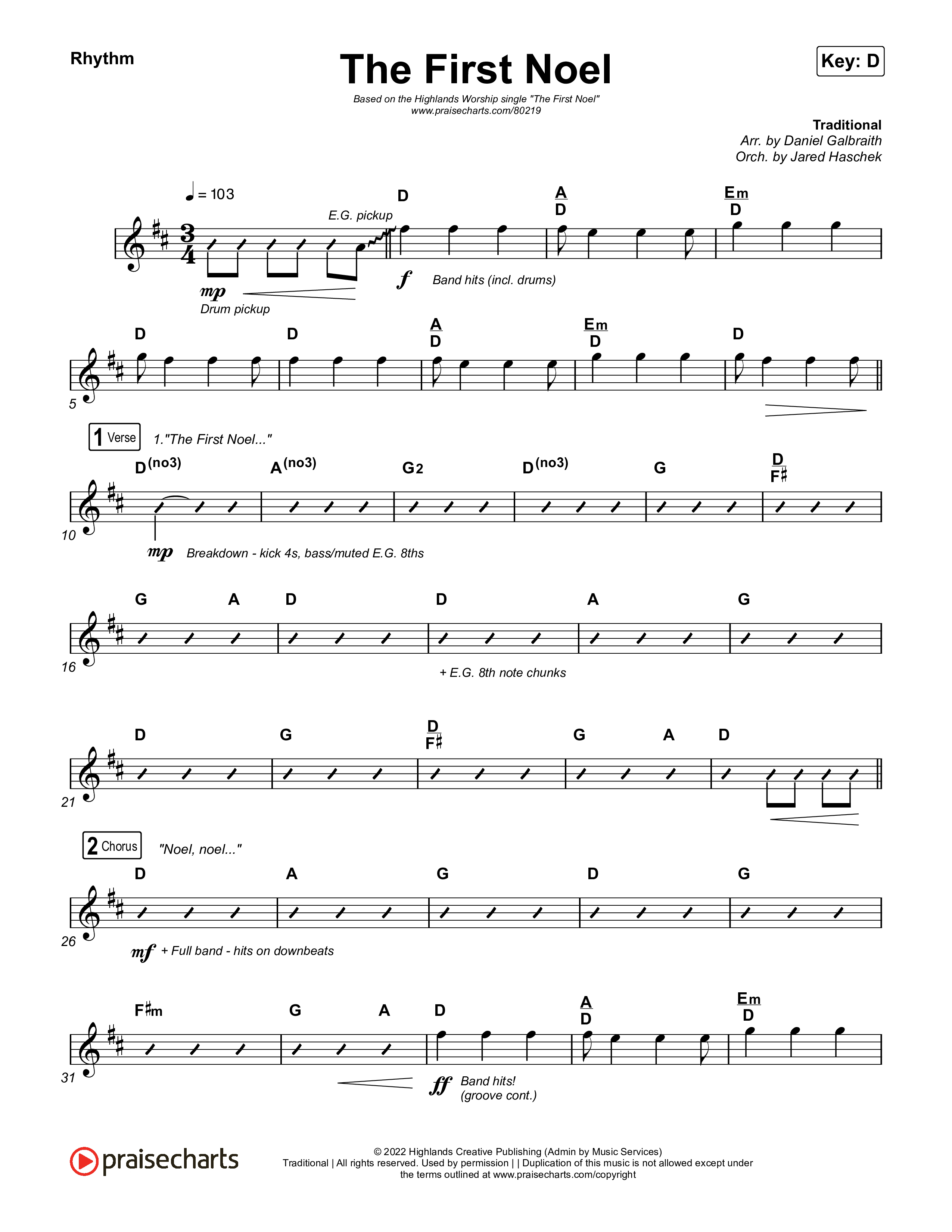Download the Rhythm Chart for The First Noel by Highlands Worship, from the album Christ Is Born. This song was arranged by Daniel Galbraith / Jared Haschek in the key of C, D.