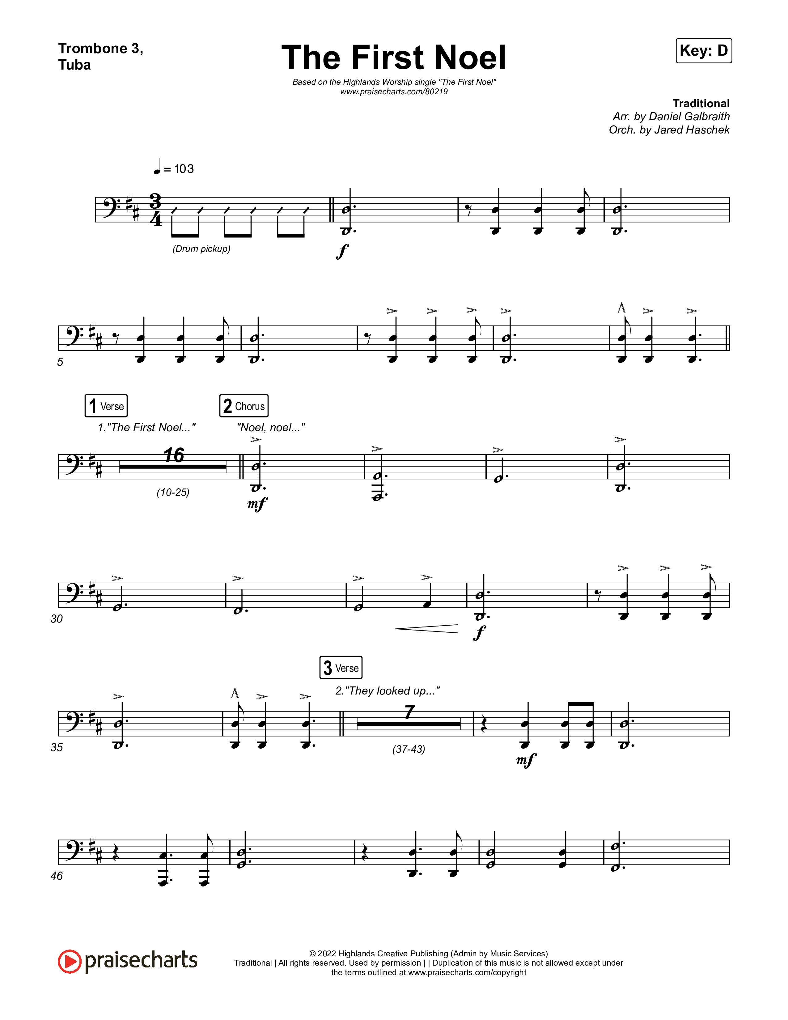 Download the Trombone 3/Tuba sheet music for The First Noel by Highlands Worship, from the album Christ Is Born. This song was arranged by Daniel Galbraith / Jared Haschek in the key of C, D.