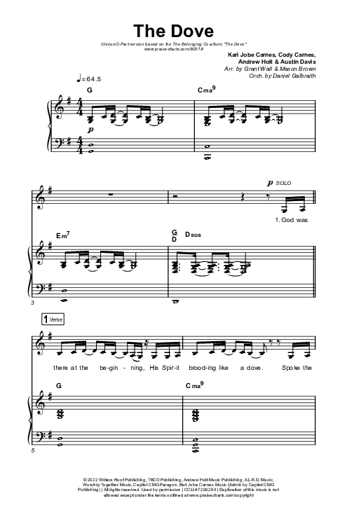 Download the Octavo sheet music for The Dove (Unison/2-Part Choir) by The Belonging Co / Kari Jobe / Arr. Mason Brown, from the album The Dove. This song was arranged by Mason Brown / Daniel Galbraith / Grant Wall in the key of G.