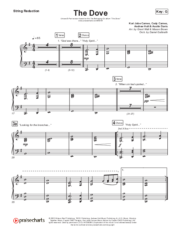 Download the String Reduction sheet music for The Dove (Unison/2-Part Choir) by The Belonging Co / Kari Jobe / Arr. Mason Brown, from the album The Dove. This song was arranged by Mason Brown / Daniel Galbraith / Grant Wall in the key of G.