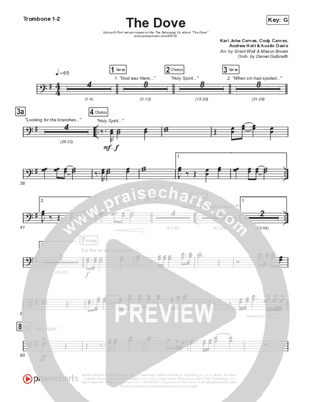 Download the Trombone 1,2 sheet music for The Dove (Unison/2-Part Choir) by The Belonging Co / Kari Jobe / Arr. Mason Brown, from the album The Dove. This song was arranged by Mason Brown / Daniel Galbraith / Grant Wall in the key of G.
