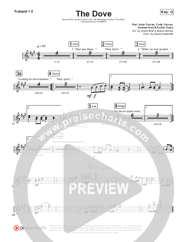 Download the trumpet sheet music for The Dove (Unison/2-Part Choir) by The Belonging Co / Kari Jobe / Arr. Mason Brown, from the album The Dove. This song was arranged by Mason Brown / Daniel Galbraith / Grant Wall in the key of G.
