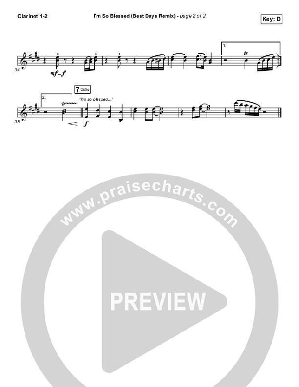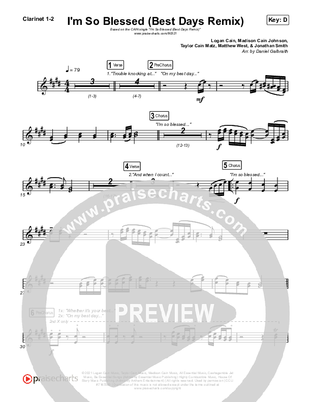 Download the Clarinet sheet music for I'm So Blessed (Best Day Remix) by CAIN, from the album I'm So Blessed (Best Day Remix). This song was arranged by Daniel Galbraith in the key of C, D.