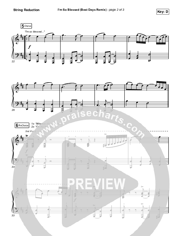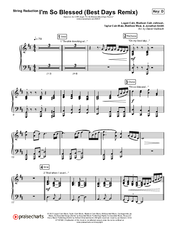 Download the String Reduction sheet music for I'm So Blessed (Best Day Remix) by CAIN, from the album I'm So Blessed (Best Day Remix). This song was arranged by Daniel Galbraith in the key of C, D.