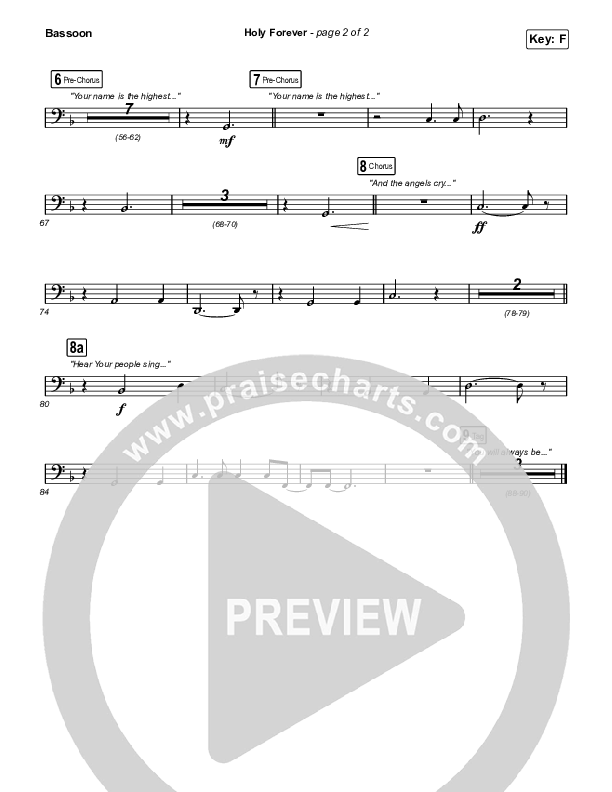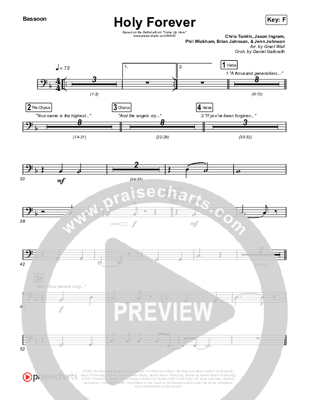 Download the Bassoon sheet music for Holy Forever by Bethel Music, from the album Come Up Here. This song was arranged by Grant Wall / Daniel Galbraith in the key of F, G.