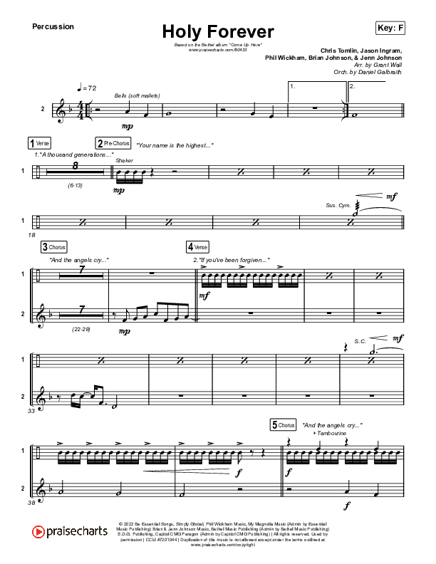 Download the percussion sheet music for Holy Forever by Bethel Music, from the album Come Up Here. This song was arranged by Grant Wall / Daniel Galbraith in the key of F, G.