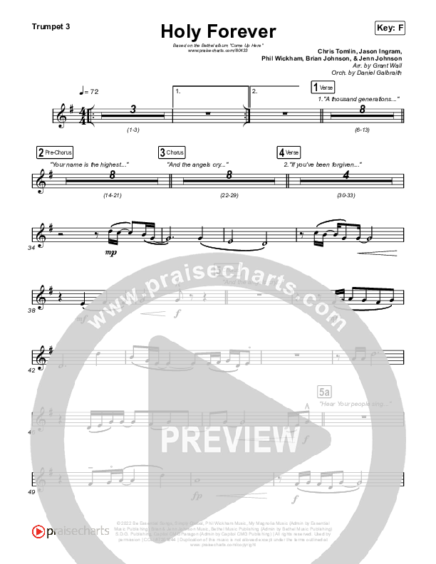 Download the trumpet sheet music for Holy Forever by Bethel Music, from the album Come Up Here. This song was arranged by Grant Wall / Daniel Galbraith in the key of F, G.
