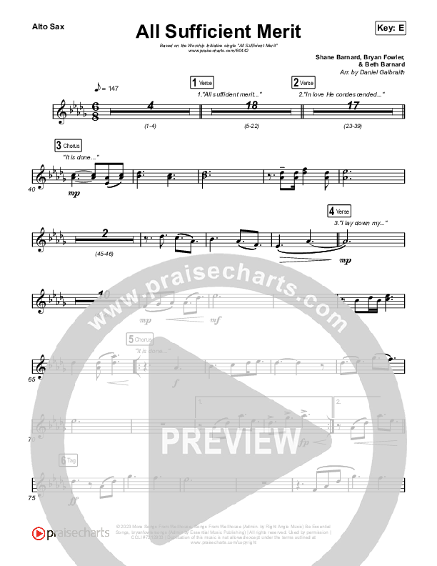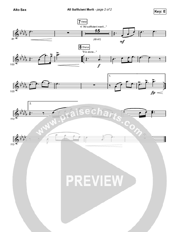 Download the AltoSax sheet music for All Sufficient Merit by The Worship Initiative / Bethany Barnard, from the album All Sufficient Merit. This song was arranged by Daniel Galbraith in the key of E, F.