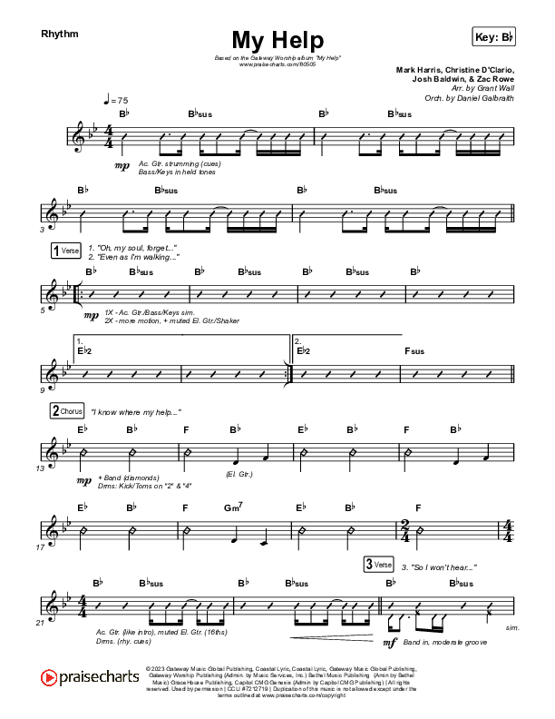 Download the Rhythm Chart for My Help by Gateway Worship / Josh Baldwin, from the album My Help. This song was arranged by Grant Wall / Daniel Galbraith in the key of A, Bb.