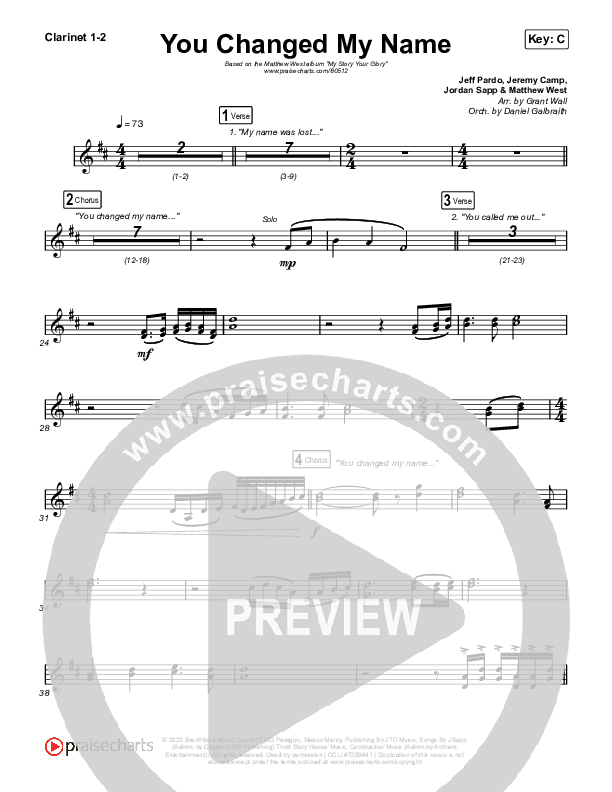 Download the Clarinet sheet music for You Changed My Name by Matthew West, from the album My Story Your Glory. This song was arranged by Grant Wall / Daniel Galbraith in the key of Bb, C.