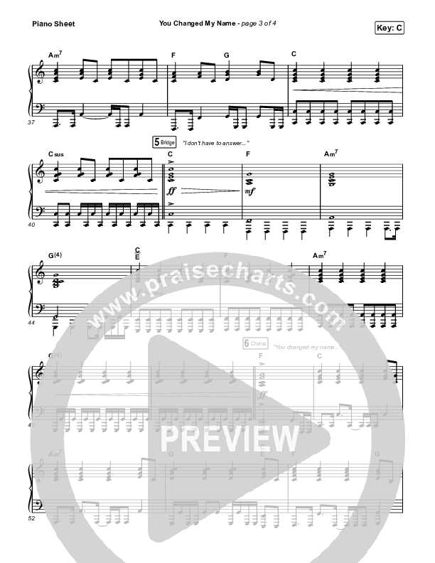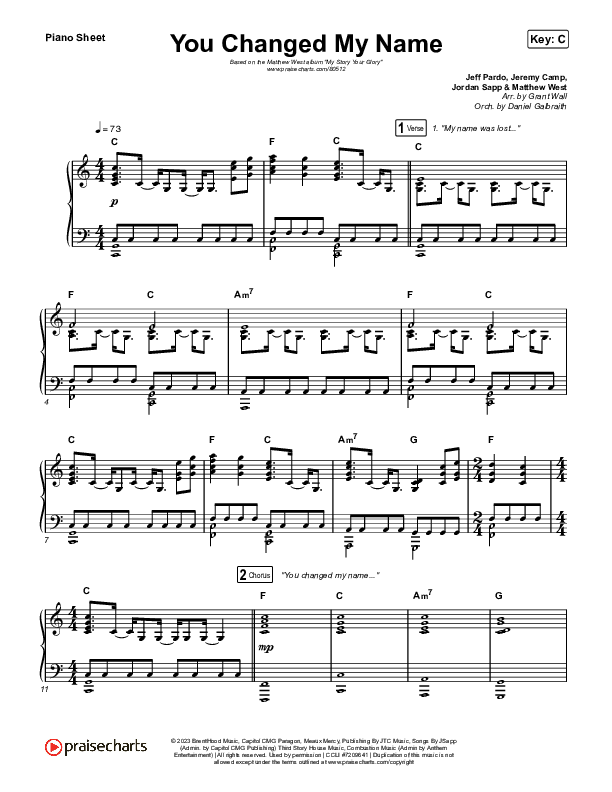 Download the piano sheet for You Changed My Name by Matthew West, from the album My Story Your Glory. This song was arranged by Grant Wall / Daniel Galbraith in the key of Bb, C.