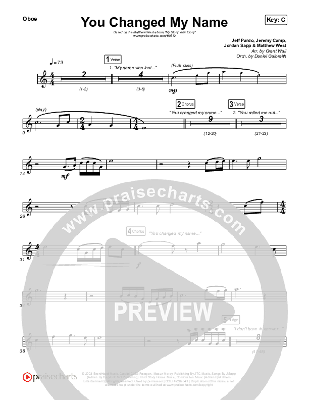 Download the Orchestration wind parts for You Changed My Name by Matthew West, from the album My Story Your Glory. This song was arranged by Grant Wall / Daniel Galbraith in the key of Bb, C.