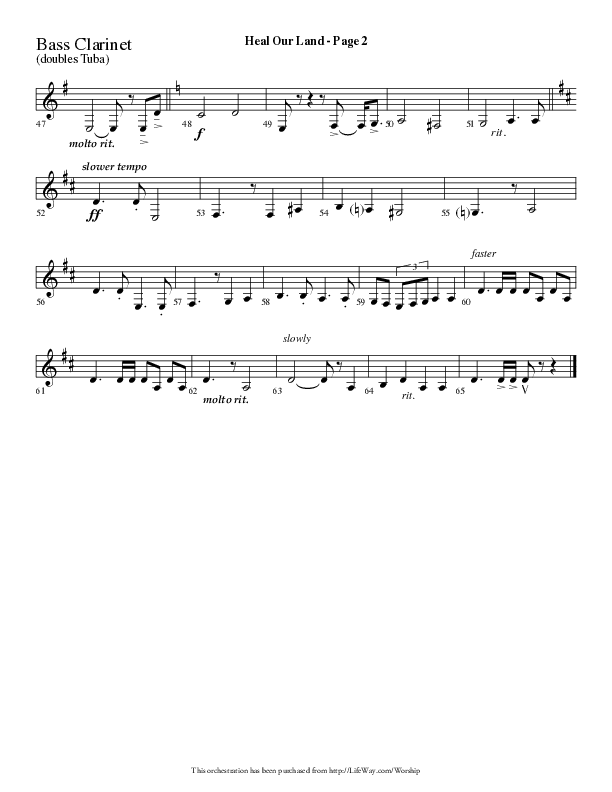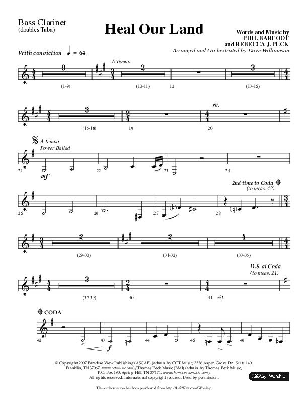 Download the Bass Clarinet sheet music for Heal Our Land (Choral Anthem SATB) by Lifeway Choral / Arr. Dave Williamson, from the album Patriotic Choral Anthems. This song was arranged by Dave Williamson in the key of Bb.