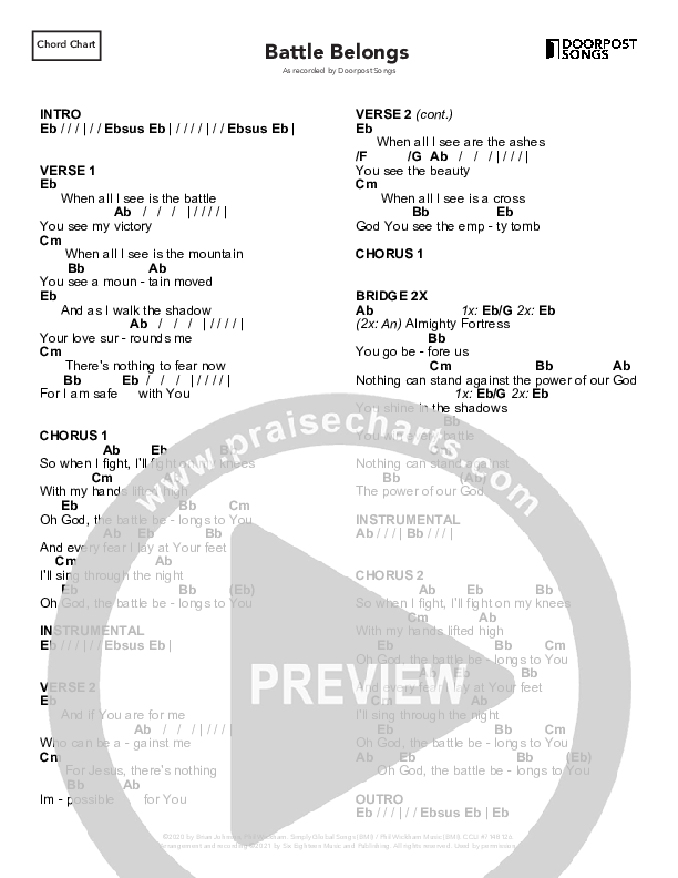 Download the PDF Chord Charts for Battle Belongs (Kids) by Doorpost Kids Worship / Dave and Jess Ray, from the album Doorpost Worship Volume 1. This song was arranged by David Ray in the key of Eb.