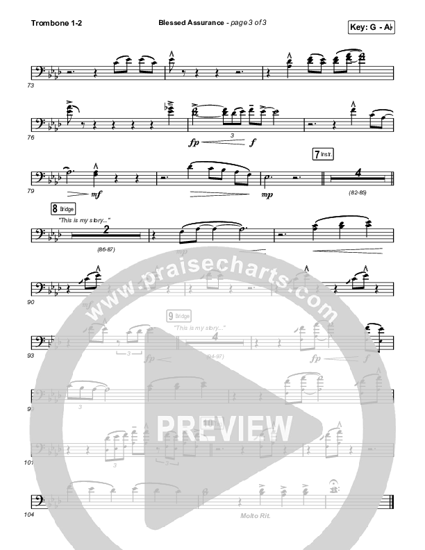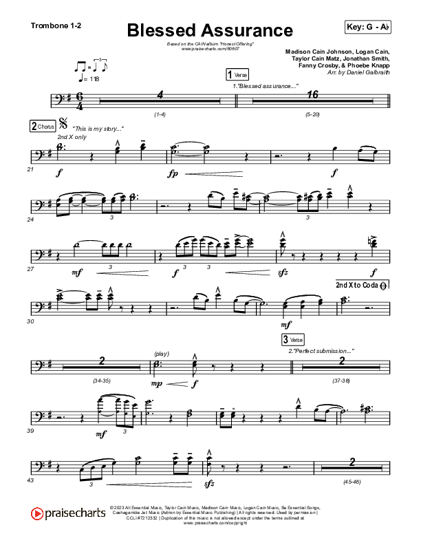 Download the Trombone 1,2 sheet music for Blessed Assurance (Live) by CAIN / David Leonard, from the album Honest Offering. This song was arranged by Daniel Galbraith in the key of F, G.
