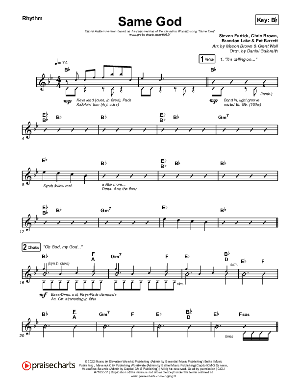 Download the PDF sheet music for Same God (Unison/2-Part) by Elevation Worship / Arr. Mason Brown, from the album Same God. This song was arranged by Mason Brown / Daniel Galbraith / Grant Wall in the key of Bb.
