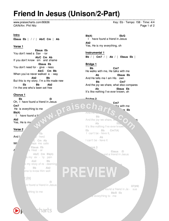 Download the PDF Chord Charts for Friend In Jesus (Unison/2-Part) by CAIN / Arr. Phil Nitz, from the album Honest Offering. This song was arranged by Phil Nitz / Daniel Galbraith / Grant Wall in the key of Eb.