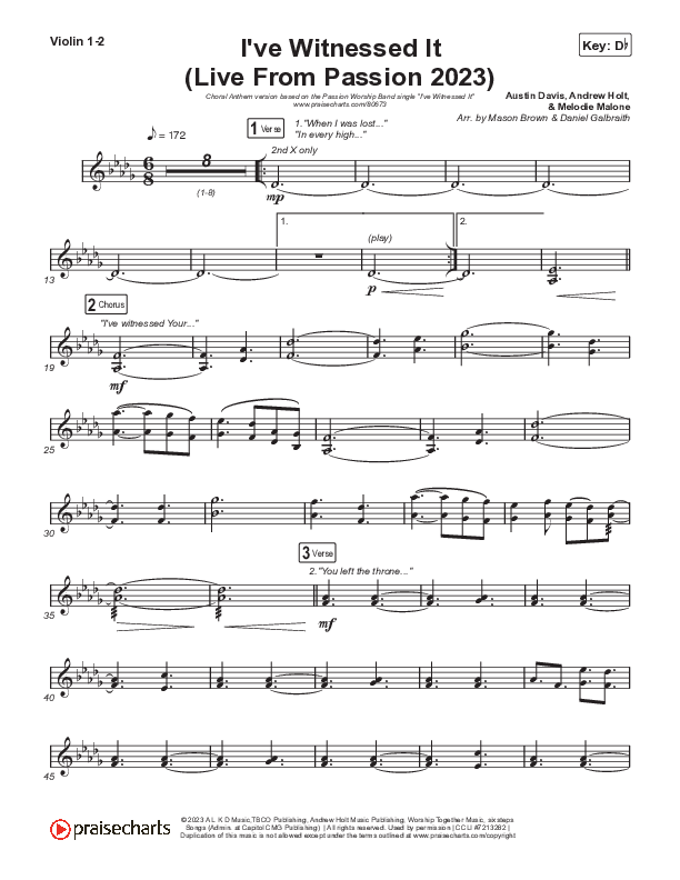 Download the Violin sheet music for I've Witnessed It (Choral Anthem SATB) by Passion / Melodie Malone / Arr. Mason Brown, from the album I've Witnessed It. This song was arranged by Mason Brown in the key of Db.