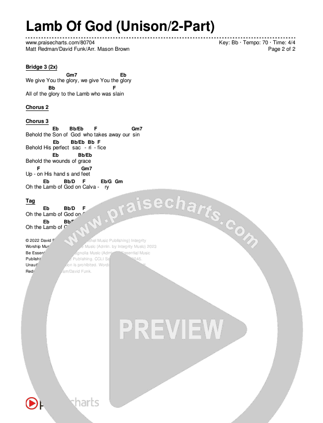 Download the PDF Chord Charts for Lamb Of God (Unison/2-Part) by Matt Redman / David Funk / Arr. Mason Brown, from the album Lamb Of God. This song was arranged by Mason Brown / Daniel Galbraith in the key of Bb.