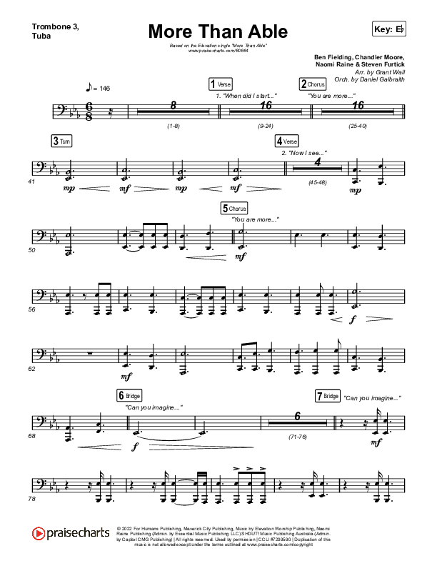 Download the Trombone 3/Tuba sheet music for More Than Able by Elevation Worship / Chandler Moore / Tiffany Hudson, from the album Can You Imagine?. This song was arranged by Grant Wall / Daniel Galbraith in the key of C, D, Eb.