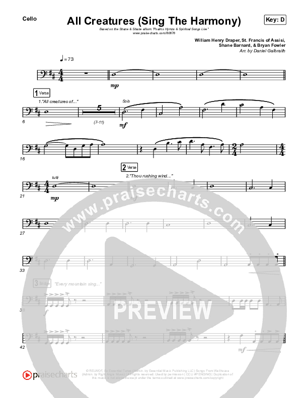 Download the Cello sheet music for All Creatures (Sing In Harmony) (Live) by Shane & Shane, from the album Psalms Hymns And Spiritual Songs (Live). This song was arranged by Daniel Galbraith in the key of C, D.