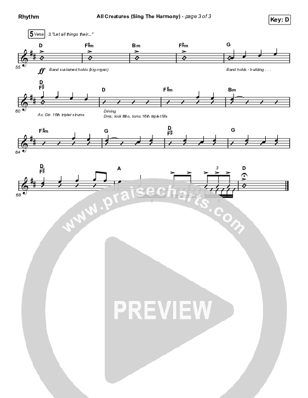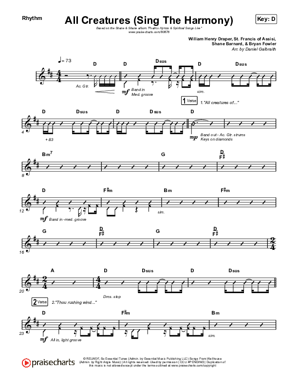 Download the Rhythm Chart for All Creatures (Sing In Harmony) (Live) by Shane & Shane, from the album Psalms Hymns And Spiritual Songs (Live). This song was arranged by Daniel Galbraith in the key of C, D.