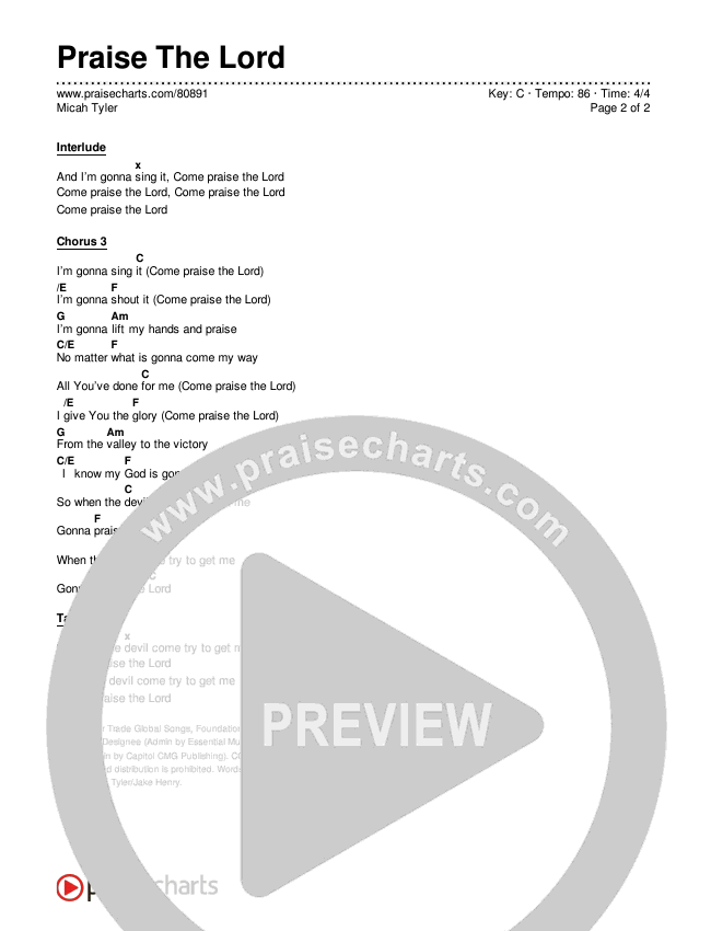 Download the PDF Chord Charts for Praise The Lord by Micah Tyler, from the album People Like Us.