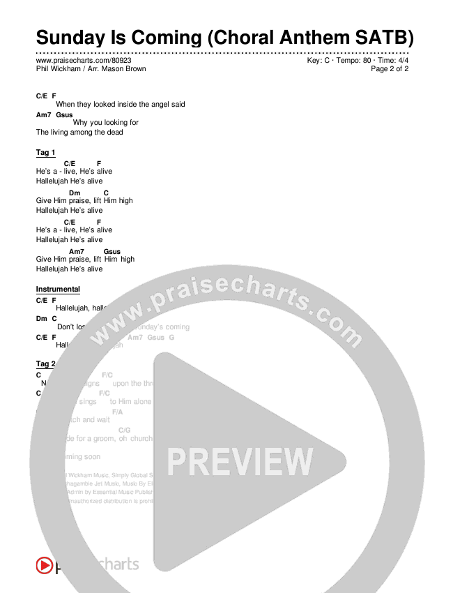 Download the PDF Chord Charts for Sunday Is Coming (Choral Anthem SATB) by Phil Wickham / Arr. Mason Brown, from the album Sunday Is Coming. This song was arranged by Mason Brown / Daniel Galbraith in the key of C.