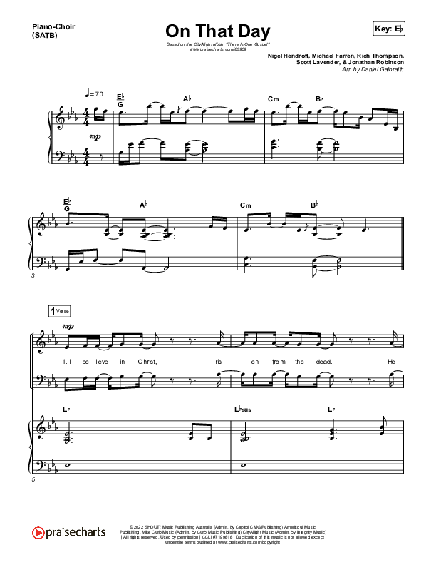 Download the sheet music for On That Day (Live) by CityAlight, from the album There Is One Gospel (Live). This song was arranged by Daniel Galbraith in the key of D, Eb.