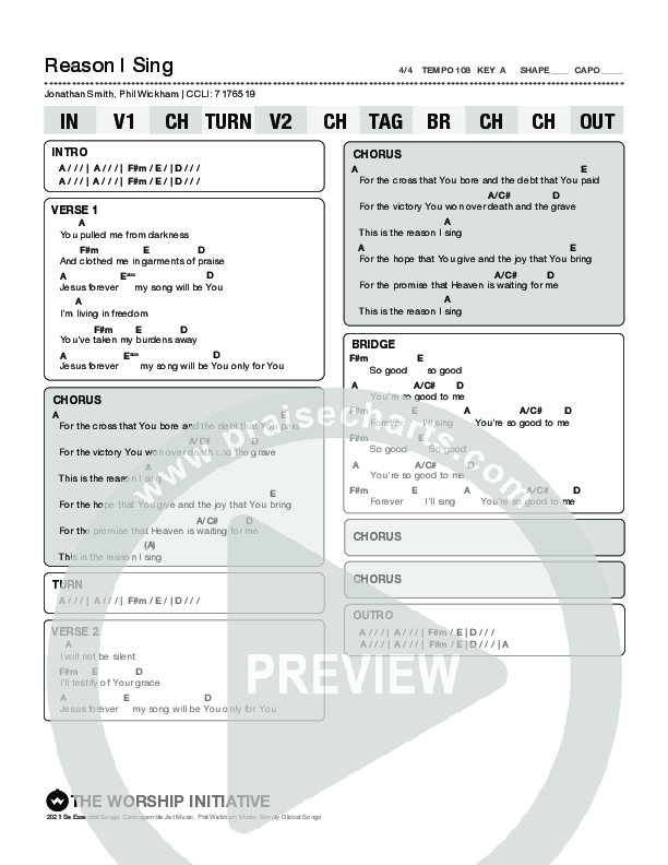 Download the PDF Chord Charts for Reason I Sing by The Worship Initiative, from the album Reason I Sing.