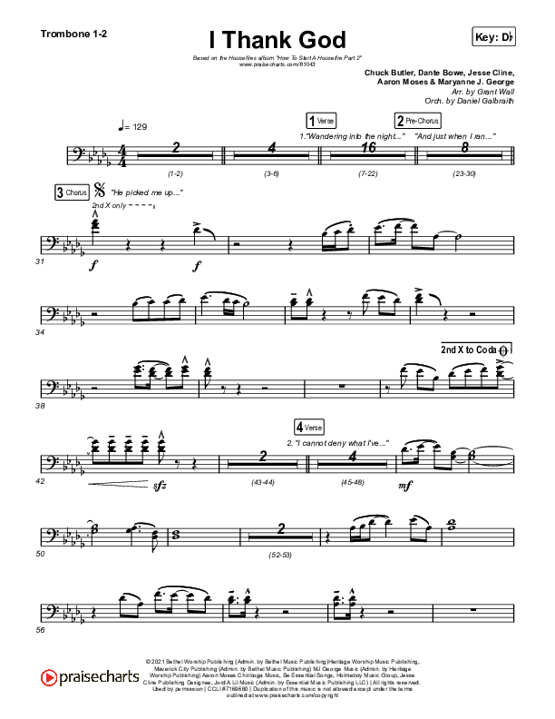 Download the Trombone 1,2 sheet music for I Thank God by Housefires / JWLKRS Worship, from the album How To Start A Housefire Part 2. This song was arranged by Grant Wall / Daniel Galbraith in the key of Bb, C, Db.