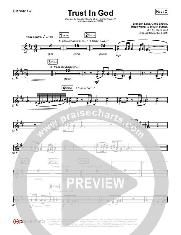 Download the Clarinet sheet music for Trust In God by Elevation Worship / Chris Brown, from the album Can You Imagine?. This song was arranged by Grant Wall / Daniel Galbraith in the key of A, Bb, C, Db.