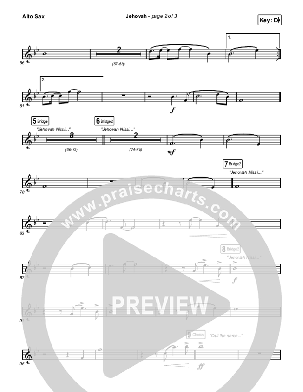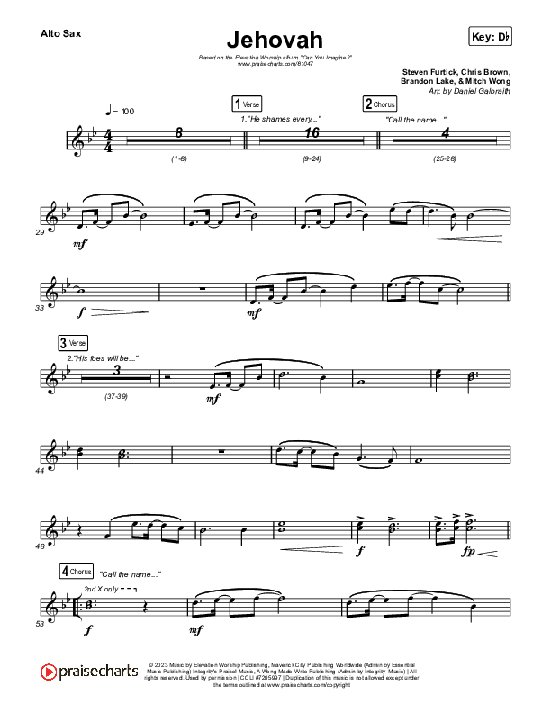 Download the Saxaphone instruments PDF sheet music for Jehovah by Elevation Worship / Chris Brown, from the album Can You Imagine?. This song was arranged by Daniel Galbraith in the key of C, Db.