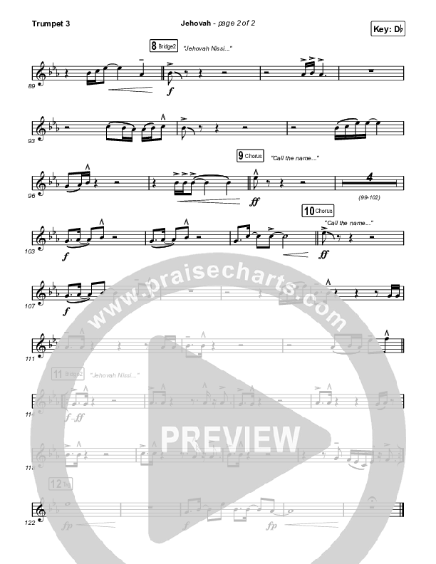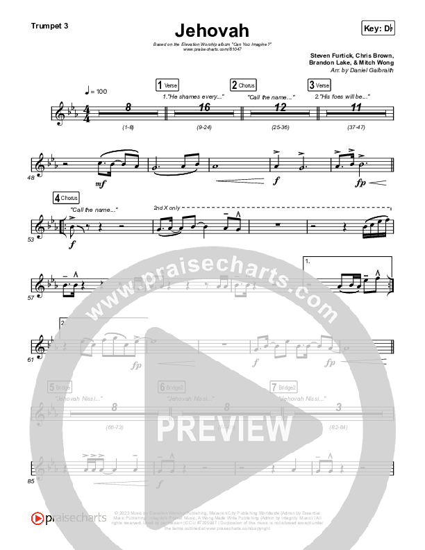 Download the Trumpet 3 sheet music for Jehovah by Elevation Worship / Chris Brown, from the album Can You Imagine?. This song was arranged by Daniel Galbraith in the key of C, Db.