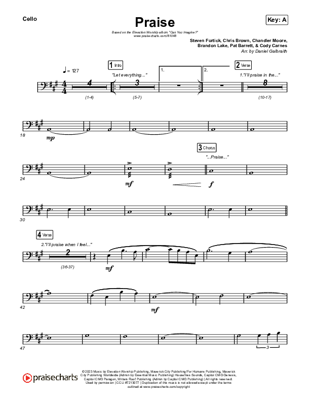 Download the Cello sheet music for Praise by Elevation Worship / Chris Brown / Brandon Lake / Chandler Moore, from the album Can You Imagine?. This song was arranged by Daniel Galbraith in the key of A, Ab, Bb, F, G.