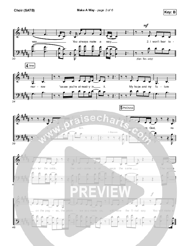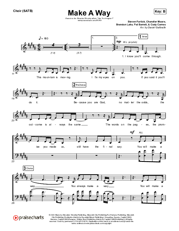 Download the Choir Sheet for Make A Way by Elevation Worship / Brandon Lake / Chandler Moore, from the album Can You Imagine?. This song was arranged by Daniel Galbraith in the key of B, Bb.