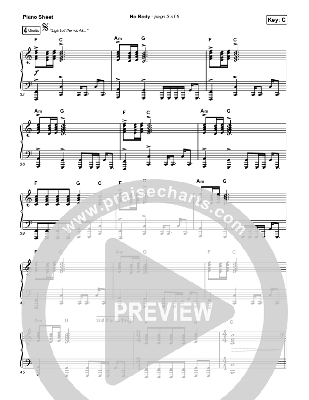 Download the piano sheet for No Body by Elevation Worship / Jonsal Barrientes, from the album Can You Imagine?. This song was arranged by Daniel Galbraith in the key of Bb, C, G.