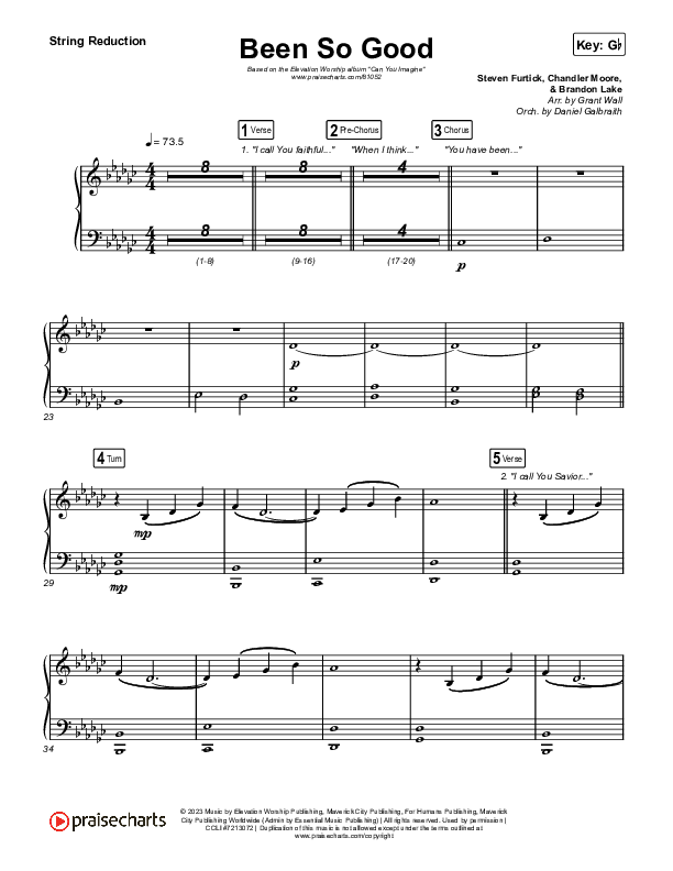 Download the String Reduction sheet music for Been So Good by Elevation Worship / Tiffany Hudson, from the album Can You Imagine?. This song was arranged by Grant Wall / Daniel Galbraith in the key of F, Gb.
