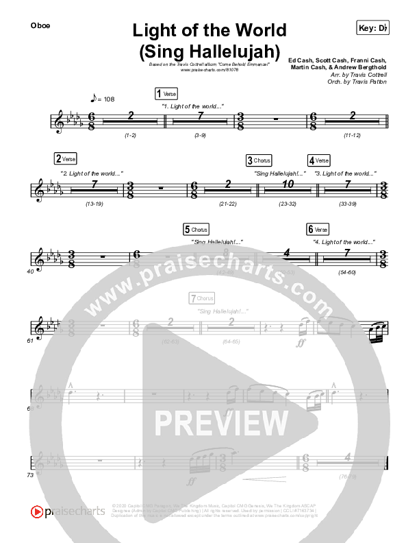 Download the Oboe sheet music for Light Of The World (Sing Hallelujah) (Choral/SATB) by Brooke Voland / Arr. Travis Cottrell / Orch. Travis Patton, from the album Come Behold Emmanuel: A Christmas Worship Celebration. This song was arranged by Travis Cottrell / Travis Patton in the key of Db.