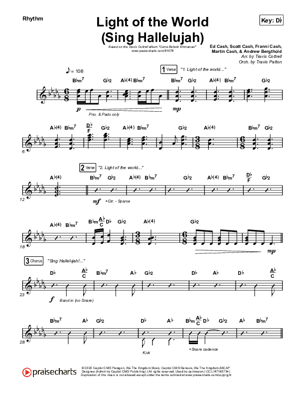 Download the PDF sheet music for Light Of The World (Sing Hallelujah) (Choral/SATB) by Brooke Voland / Arr. Travis Cottrell / Orch. Travis Patton, from the album Come Behold Emmanuel: A Christmas Worship Celebration. This song was arranged by Travis Cottrell / Travis Patton in the key of Db.