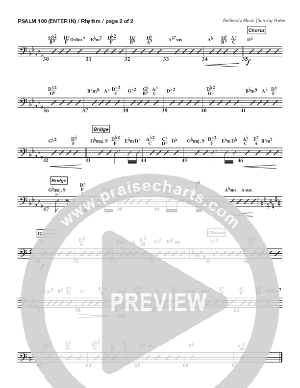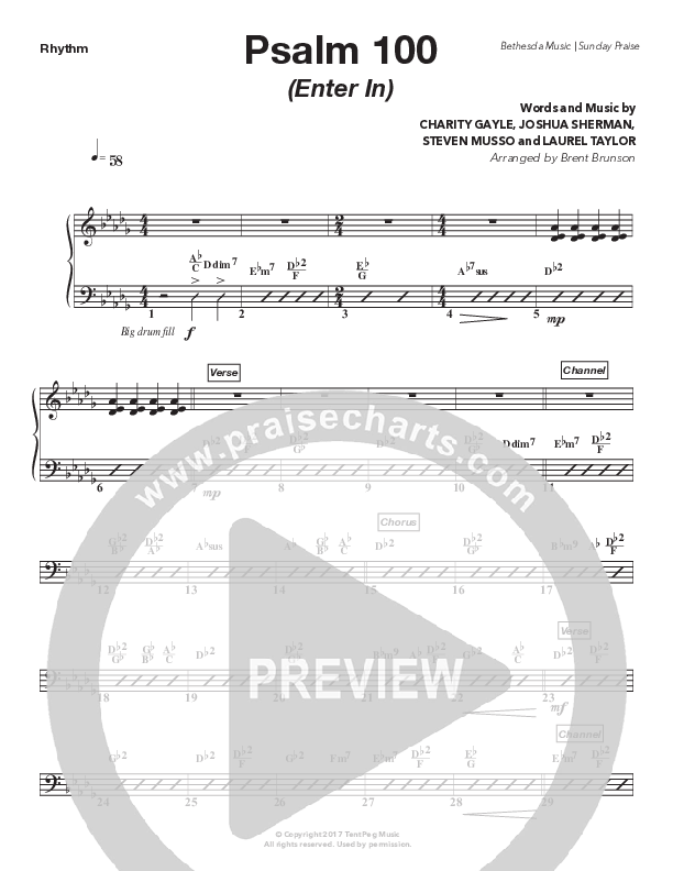 Download the Rhythm Chart for Psalm 100 (Enter In) (Live) by Bethesda Music / Arr. Brent Brunson, from the album Sunday Praise | Everlasting God (Live). This song was arranged by Brent Brunson in the key of Db.