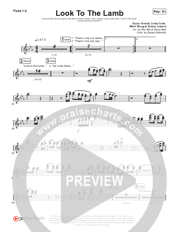 Download the Flute sheet music for Look To The Lamb (Unison/2-Part) by Bryan & Katie Torwalt / Lindy Cofer / Jesus Culture / Arr. Phil Nitz, from the album Look To The Lamb. This song was arranged by Phil Nitz / Daniel Galbraith / Grant Wall in the key of Eb.