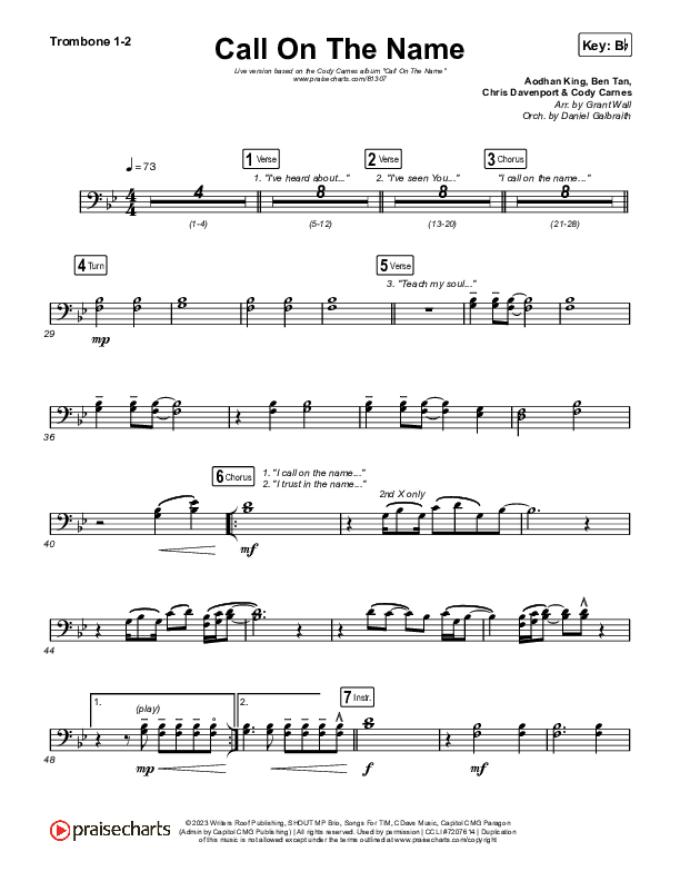 Download the Trombone sheet music for Call On The Name (Live) by Cody Carnes, from the album Firm Foundation. This song was arranged by Daniel Galbraith / Grant Wall in the key of A, Bb, C.