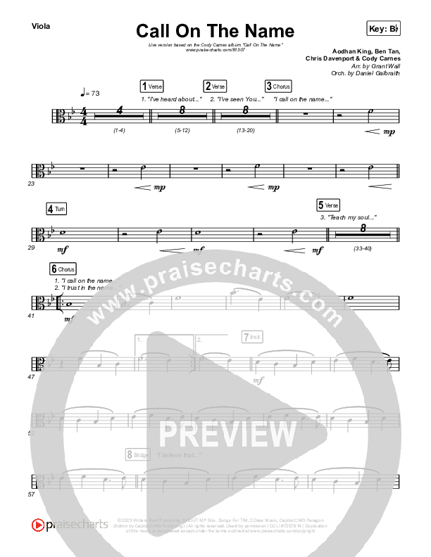 Download the Viola sheet music for Call On The Name (Live) by Cody Carnes, from the album Firm Foundation. This song was arranged by Daniel Galbraith / Grant Wall in the key of A, Bb, C.