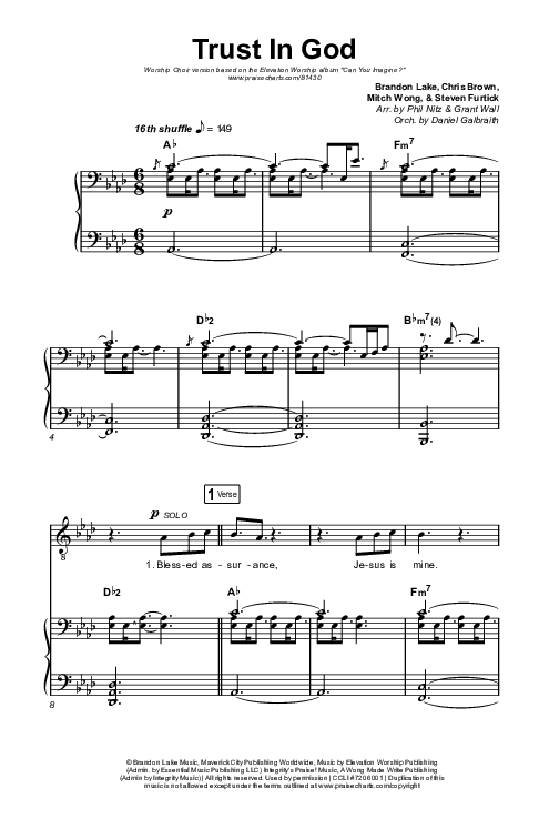 Download the Octavo (SAB) sheet music for Trust In God (Worship Choir/SAB) by Elevation Worship / Chris Brown / Arr. Phil Nitz, from the album Can You Imagine?. This song was arranged by Phil Nitz / Daniel Galbraith / Grant Wall in the key of Ab.